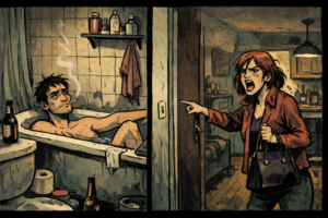 Das klingt nach edlen Motiven, auch wenn sie Kunst über die Kunst definieren – der Kern zählt. Und der hat Daniel irgendwie hierher geführt. Vor dem Waschbecken stehend schaut er in das Sammelsurium aus Wasser, Schweiß und Panik, die ihm im Gesicht stehen. Er musste noch nie vor Publikum sprechen, geschweige denn alleine auftreten, und doch hat es ihn auch am heutigen Termin des allmonatlichen Literatur-Zirkels seiner Fachschaft verschlagen. Thema heute: »Eigene Werke«.